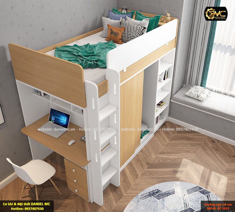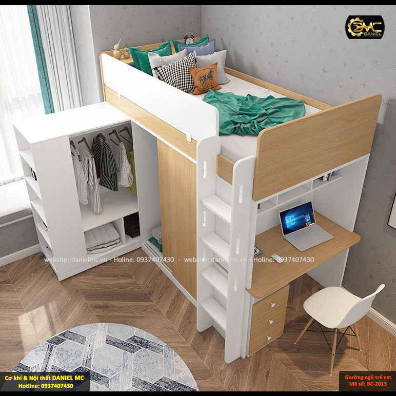 Giường ngủ trẻ em BC-2012 với đầy đủ tiện nghi giúp các bé vừa học vừa chơi thỏa thích. Bộ gường ngủ trẻ em này tích hợp cả giường ngủ + tủ quần áo + kệ sách + tủ đựng đồ chơi và bàn học..