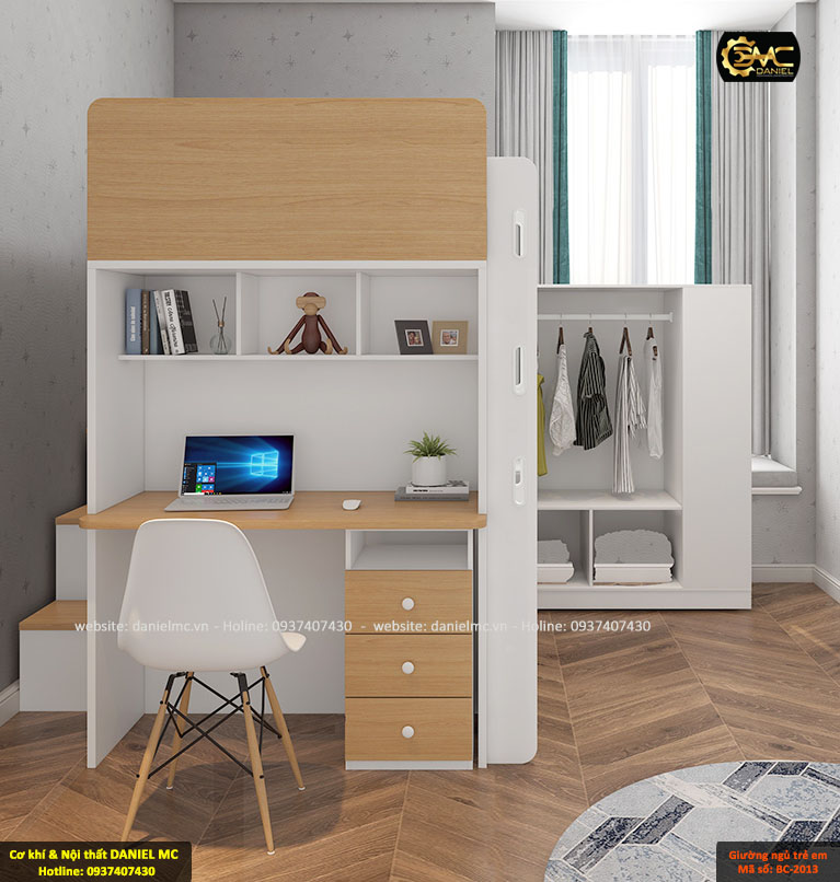 + Giường ngủ trẻ em BC-2013 với cách bổ trí tủ quần áo thông minh, có thể đẩy ra và kéo vào rất đơn giản mà không sợ bị chiếm diện tích. Ngoài việc kết hợp tủ áo, còn két hợp bàn học, kệ sách, kệ trang trí.